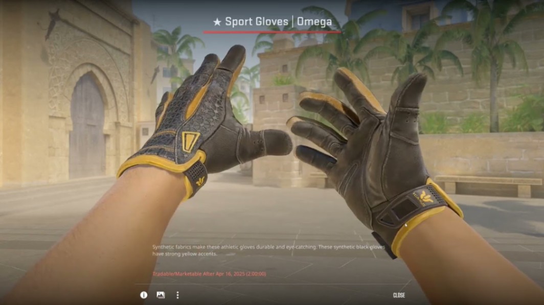 Omega gloves bring bold yellow accents, even in Well-Worn. Condition affects vibrancy, but the theme holds up. The Karambit Lore in MW pairs perfectly — especially with a clean corner and balanced gold pattern.